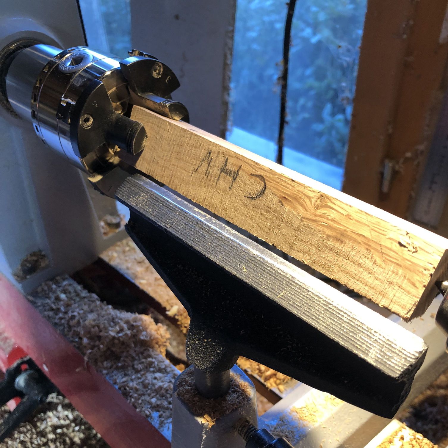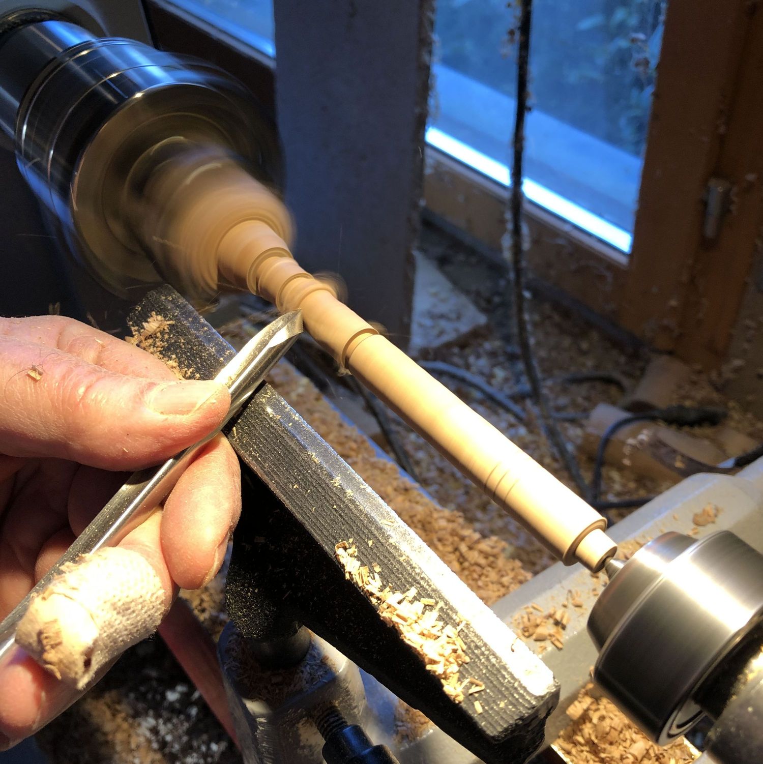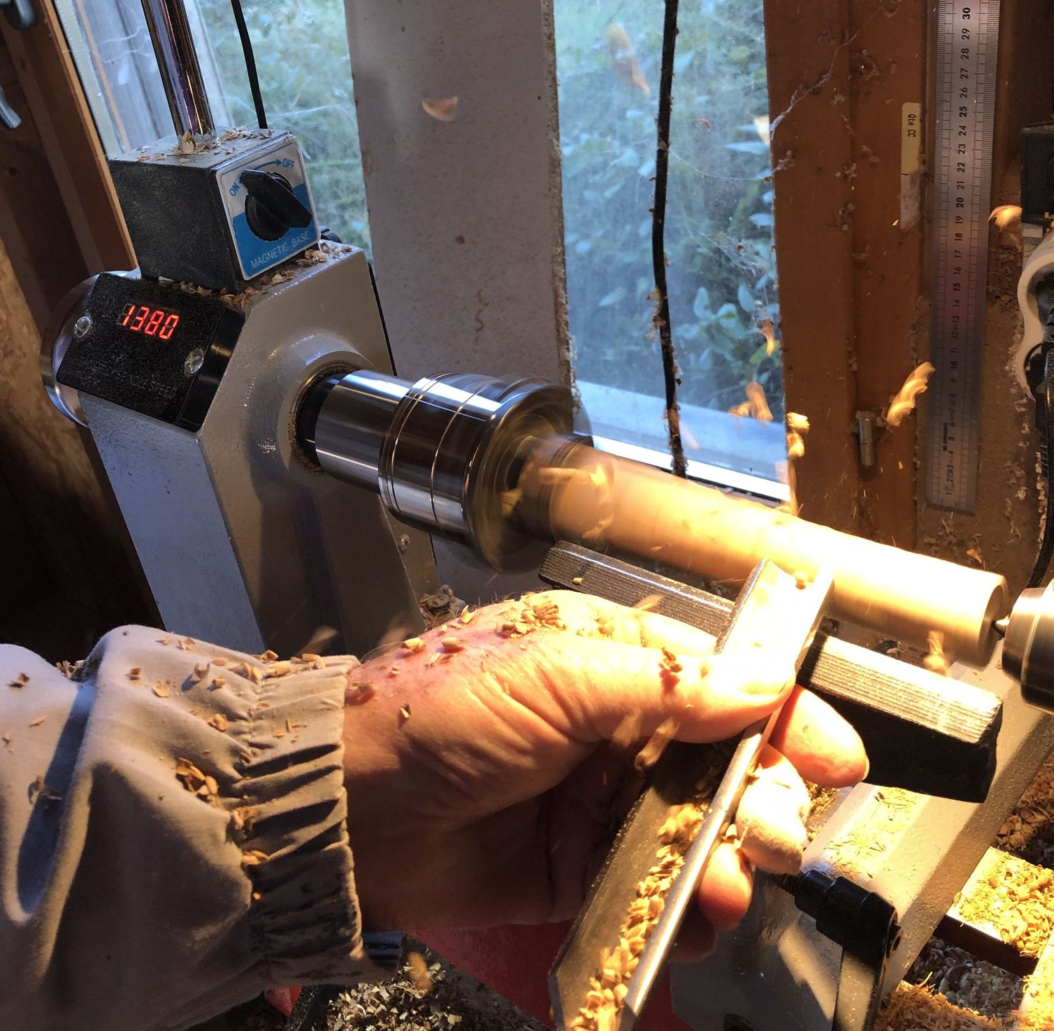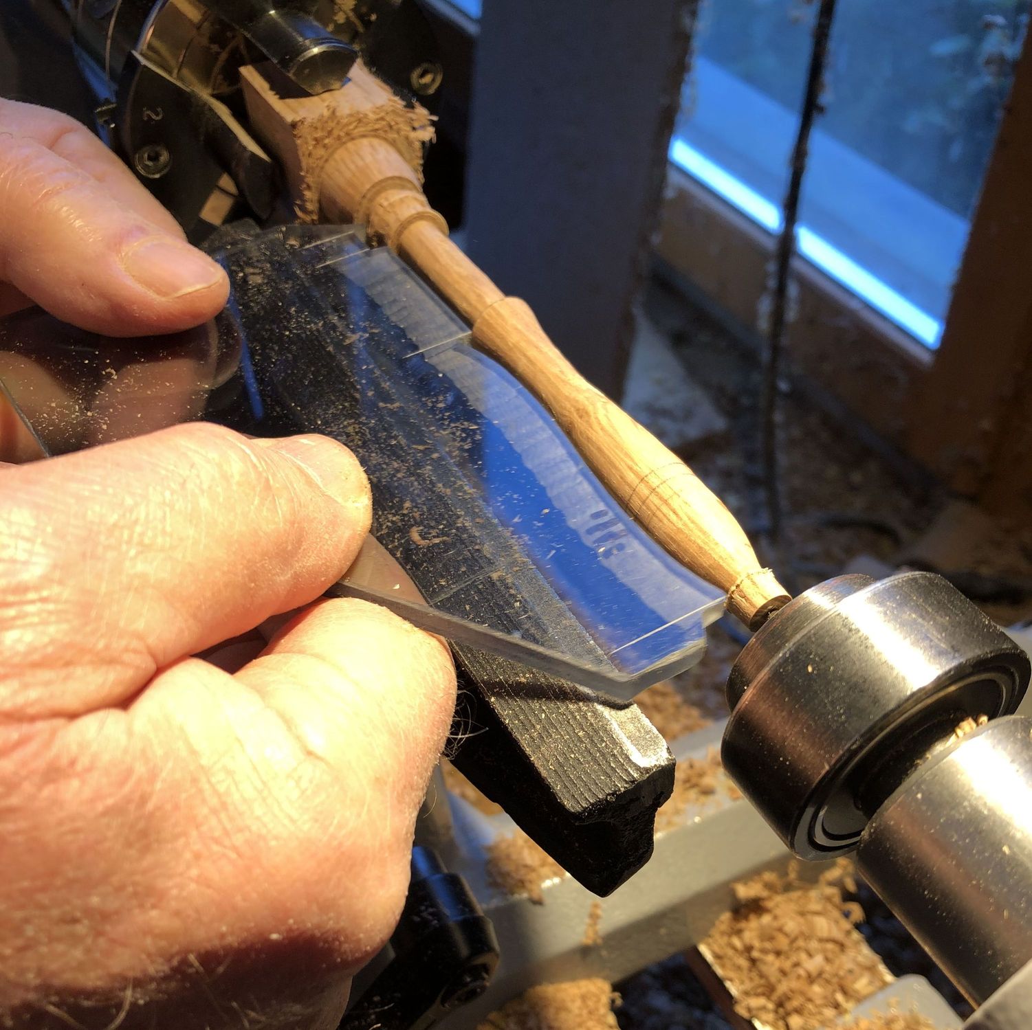 Dans le tournage sur bois artisanal, l’usinage se fait « à main levée » (*) et ce n’est donc pas le plus simple de réaliser plusieurs objets identiques ou quasi identiques. Je me suis donc aidé d’un gabarit (DIY), comme on peut le voir sur une des photos ci-dessous.