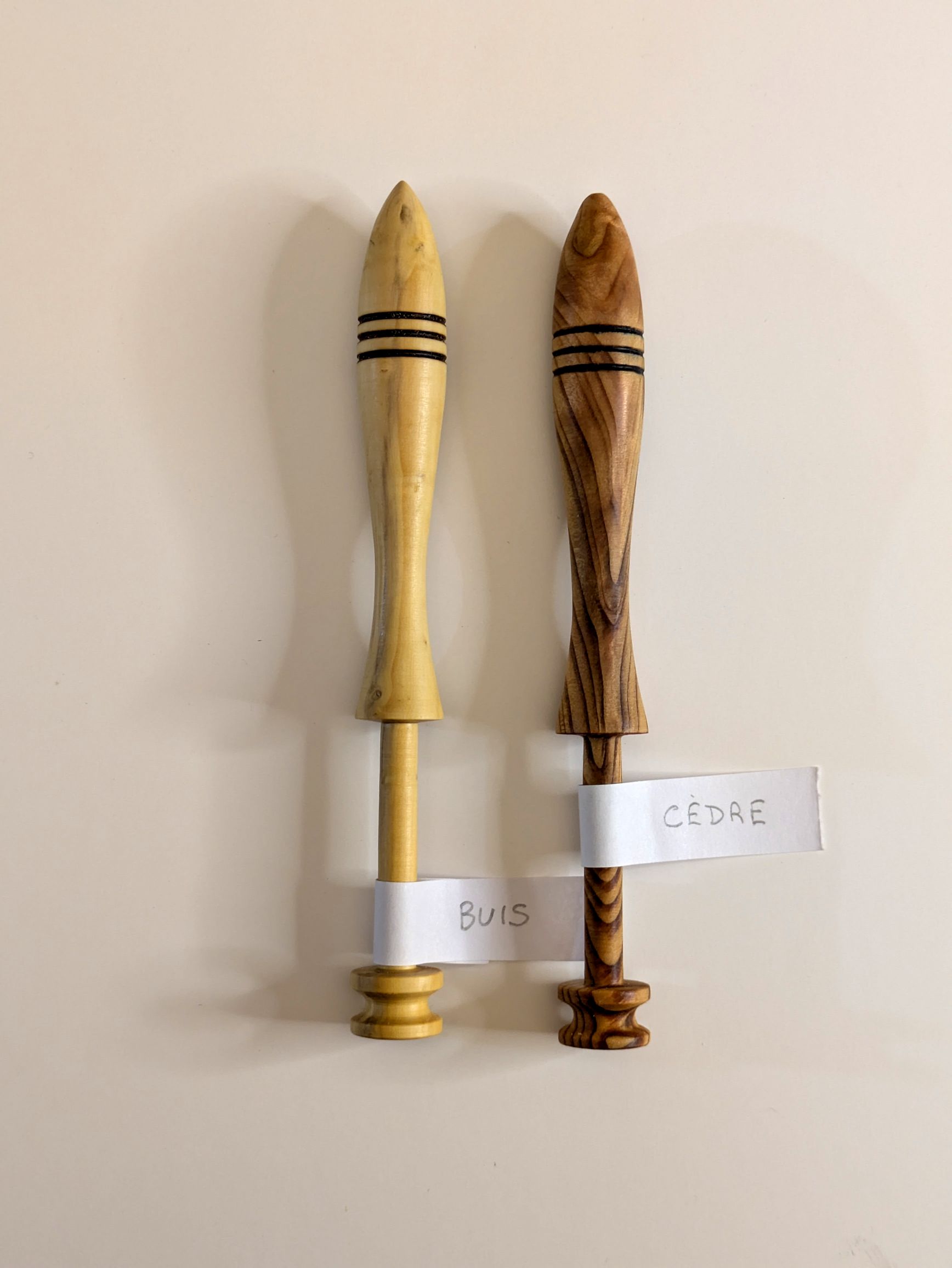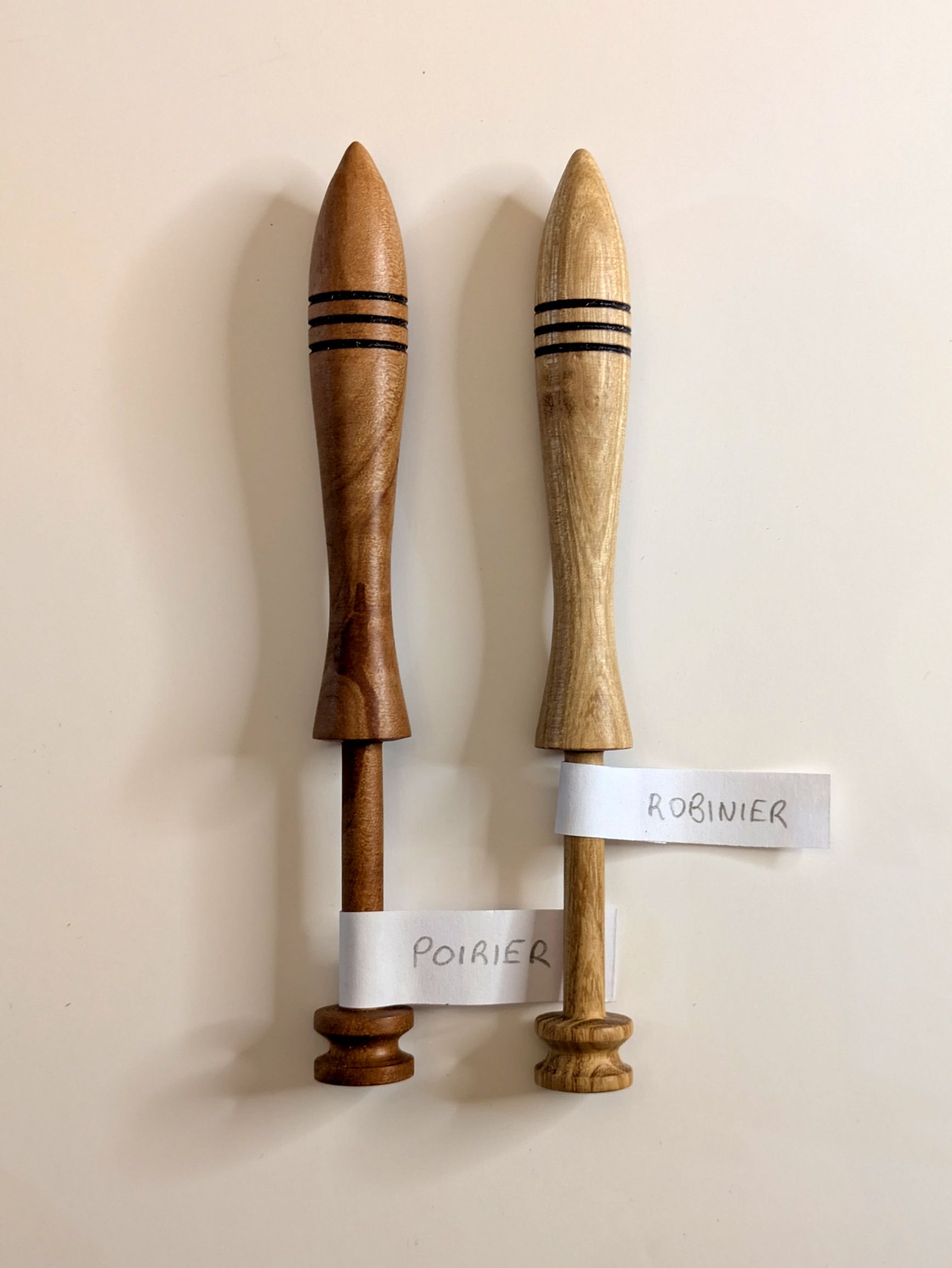 A la demande de Frédéric, un collectionneur de bois d’essences variées, j’ai réalisé au cours des derniers mois une trentaine de fuseaux de dentelière, qui probablement ne seront pas utilisés pour de la broderie ; l’idée étant d’avoir une série du même objet dans différentes essences.