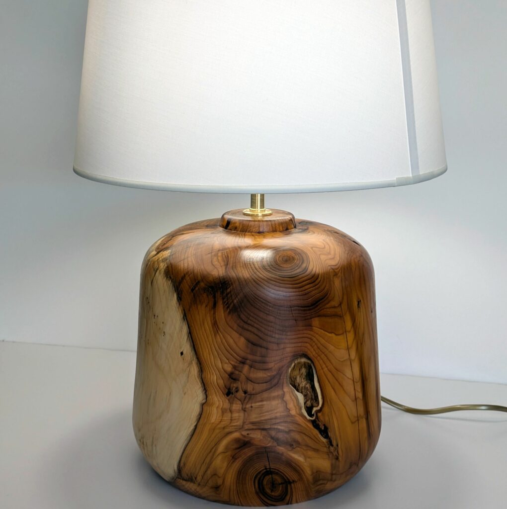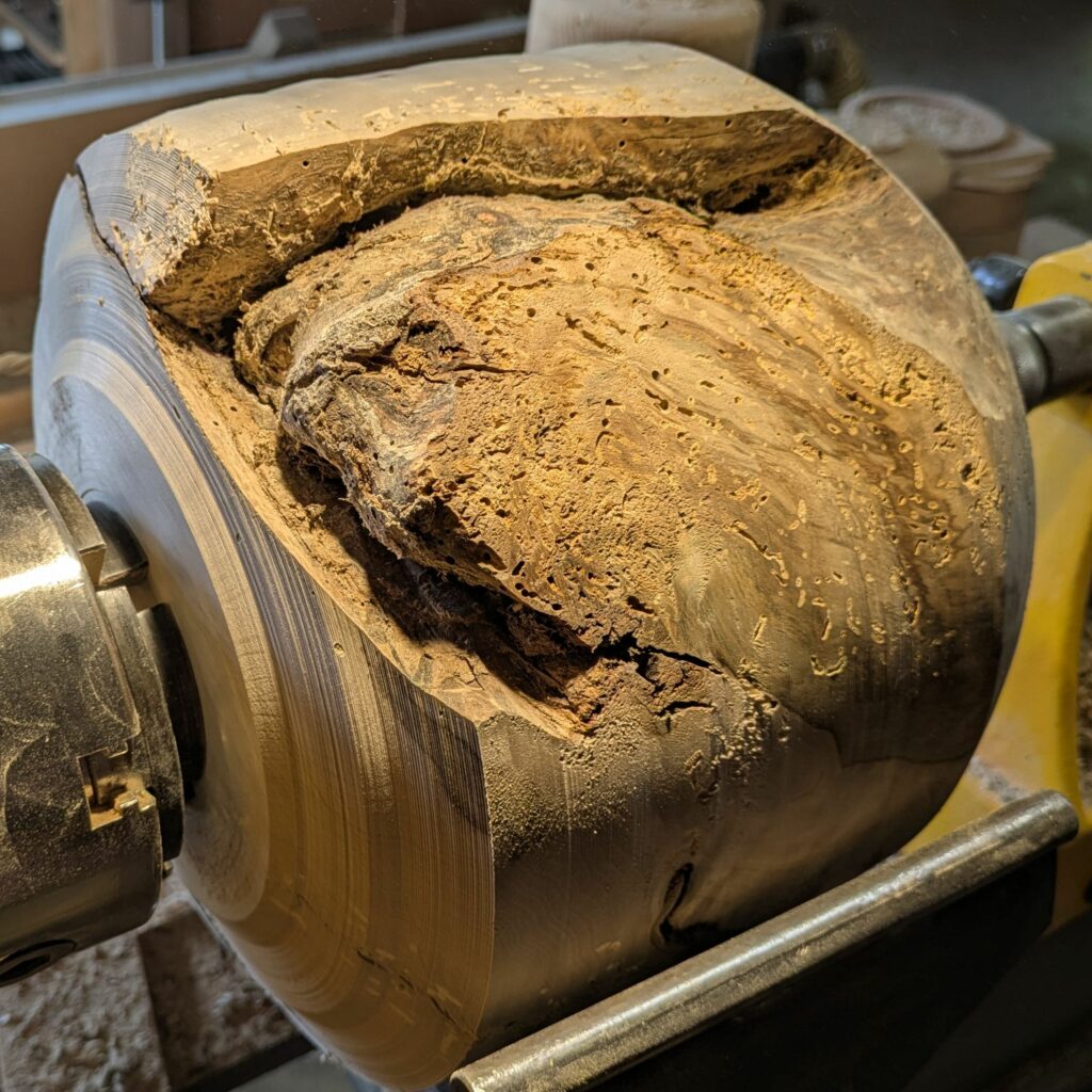 J’ai également travaillé sur des objets un peu plus gros que ces fuseaux (qui ont une longueur de 11 cm environ et un diamètre maxi de 12 mm). Notamment, j’ai fait deux pieds de lampes : l’un dans un tronc d’if (merci Freddy), dont on peut voir l’ébauche dans cet article ; et l’autre dans une loupe d’un arbre dont je ne connais pas l’essence et qui du coup est appelé ici du jesaispas.